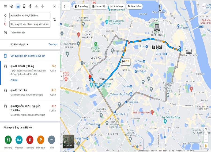 Đường đi để chủ động và thuận tiện hơn bạn chỉ cần tránh đi vào khung giờ cao điểm buổi sáng và buổi trưa, bật ứng dụng chỉ đường Google Google Maps. Sau đó nhấp vào mục tìm địa điểm từ khóa {bảo tàng Hà Nội} nhấn tiếp lựa chọn phương tiện để được chỉ dẫn.
