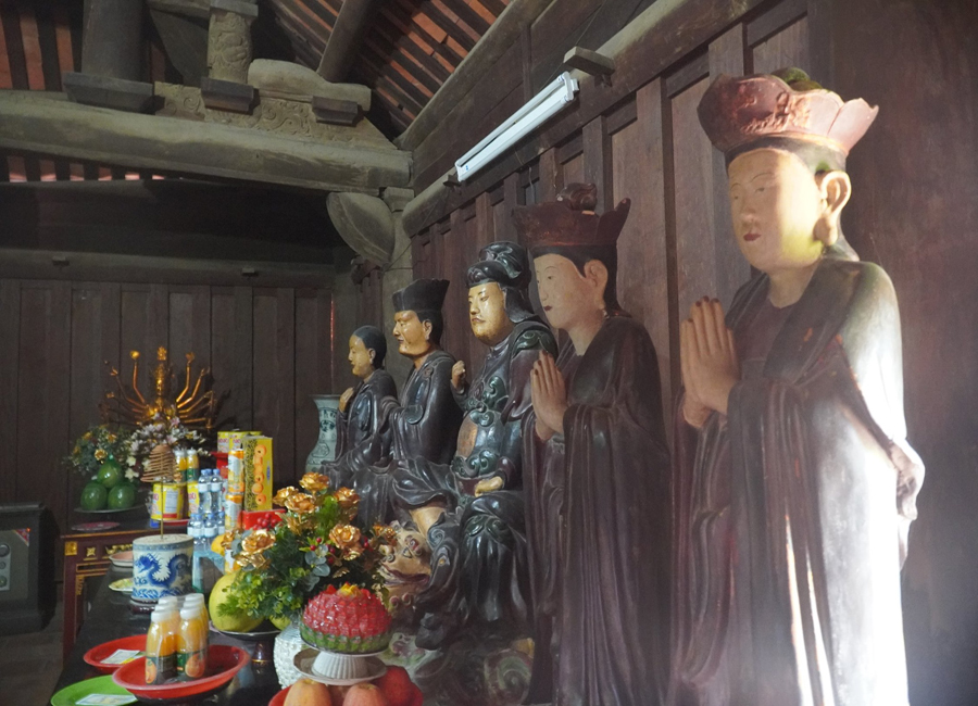 + Nhà thượng điện: Chính là ngôi nhà gian ba trái nằm ở vị trí cao nhất, mái cong được tạo khối như hoa sen, trạm trổ hình tứ linh. Trong thượng điện là tương bà Dâu hay đấy là thần Pháp Vân. Bên tay trái của bà Pháp Vân là tượng bà Pháp Vũ.
