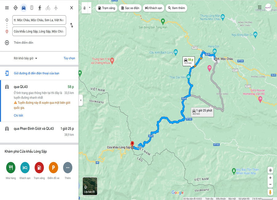 + Đường đến cửa khẩu Lóng Sập qua QL 43 khá dễ đi, nhưng nếu là đi lần đầu để tránh lạc đường, mình nghĩ bạn nên sử dụng thêm ứng dụng chỉ đường Google Maps trên thiết bị di động, gõ tìm từ khóa {Cửa khẩu Lóng Sập Mộc Châu} sau đó nhấp bắt đầu để được điều hướng chi tiết nhé!