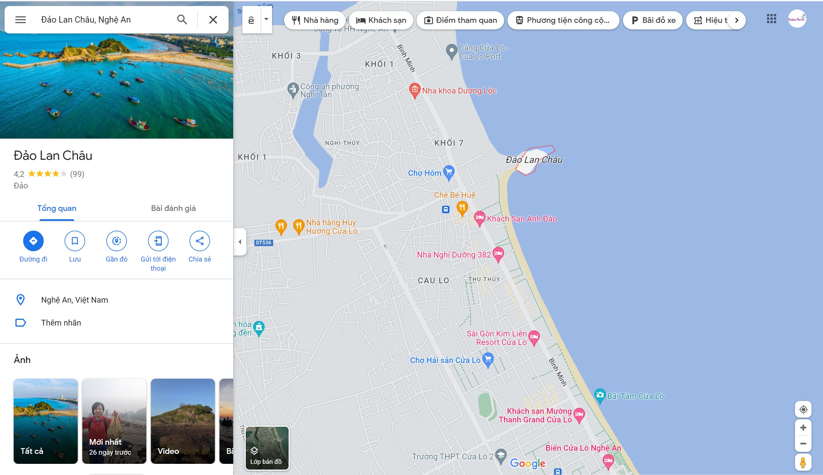 Địa chỉ đảo Lan Châu: Phường Nghi Thủy, Thị Xã Cửa Lò, tỉnh Nghệ An, Việt Nam.