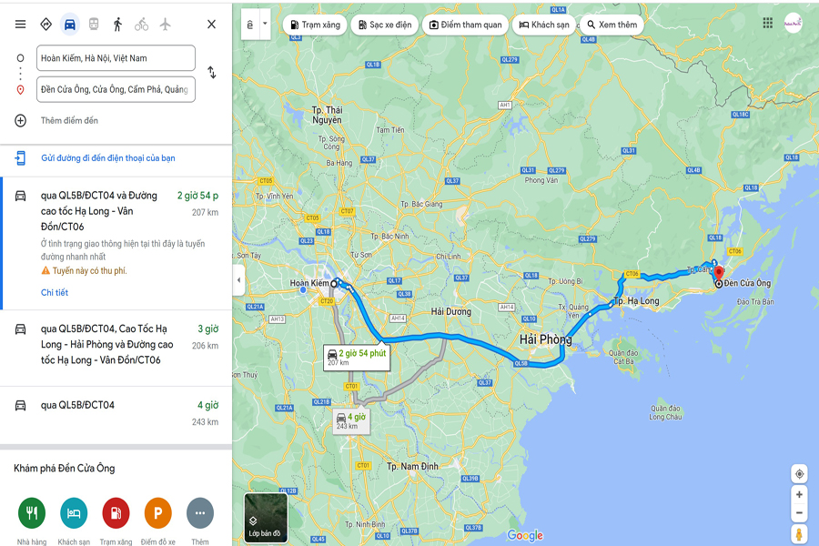 Hoặc cung đường theo hướng cao tốc Hà Nội - Hải Phòng - Quảng Ninh sexruts ngắn thời gian hơn: QL5B -> Cầu Thanh Trì -> QL10 -> Hết cao tốc bạn rẽ trái về hướng Hải Phòng -> Hạ Long -> cầu Bãi Cháy -> Cẩm Phả -> chạy thẳng là bạn thấy biển chỉ dẫn vào đến Cửa Ông.