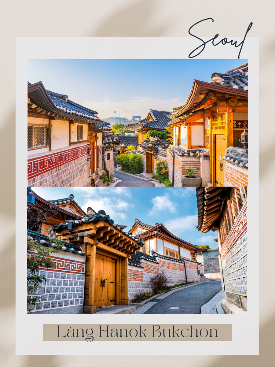 + Làng văn hóa dân tộc Hanok Bukchon: giữa một Seoul ồn ào náo nhiệt, ngôi làng cổ Hanok Bukchon với bề dày hơn 600 năm lịch sử vẫn lặng lẽ tại một góc nhỏ của đô thị lớn bậc nhất thế giới. Đến đây, quý khách như được du hành với thời gian, về lại quá khứ của thành phố Seoul với những ngôi nhà cổ truyền, thưởng thức ấm trà nóng đậm đà mang tinh túy của trời đất, tìm hiểu và khám phá những cách làm đồ thủ công mỹ nghệ tại đây mà nổi tiếng nhất là hàng thủ công làm từ giấy Hanji.