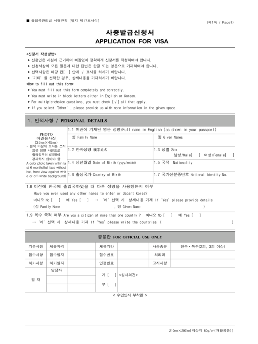 + Tờ khai thông tin xin visa Hàn Quốc theo mẫu