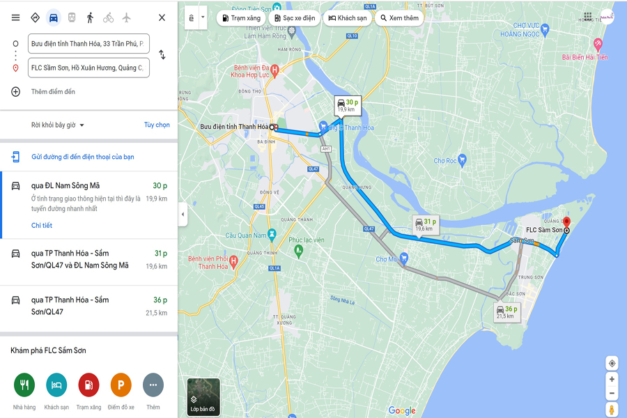 Đường đi xuất phát từ thành phố Thanh Hóa, có lẽ bạn nên lựa chọn ô tô cá nhân, dọc theo QL1A đoạn đại lộ Lê Lợi hướng đi cầu Nguyệt Viên => đến vòng xuyến đại lộ Sông Mã, xe rẽ phải đi dọc 10km nữa => đến ngã ba Hồ Xuân Hương - Đại lộ Sông Mã xe rẽ phải đi thêm 1km nữa là đến FLC Sầm Sơn rồi nhé. Hoặc bạn có thể lựa chọn xe máy nhé, cung đường cũng tương tự như ô tô.