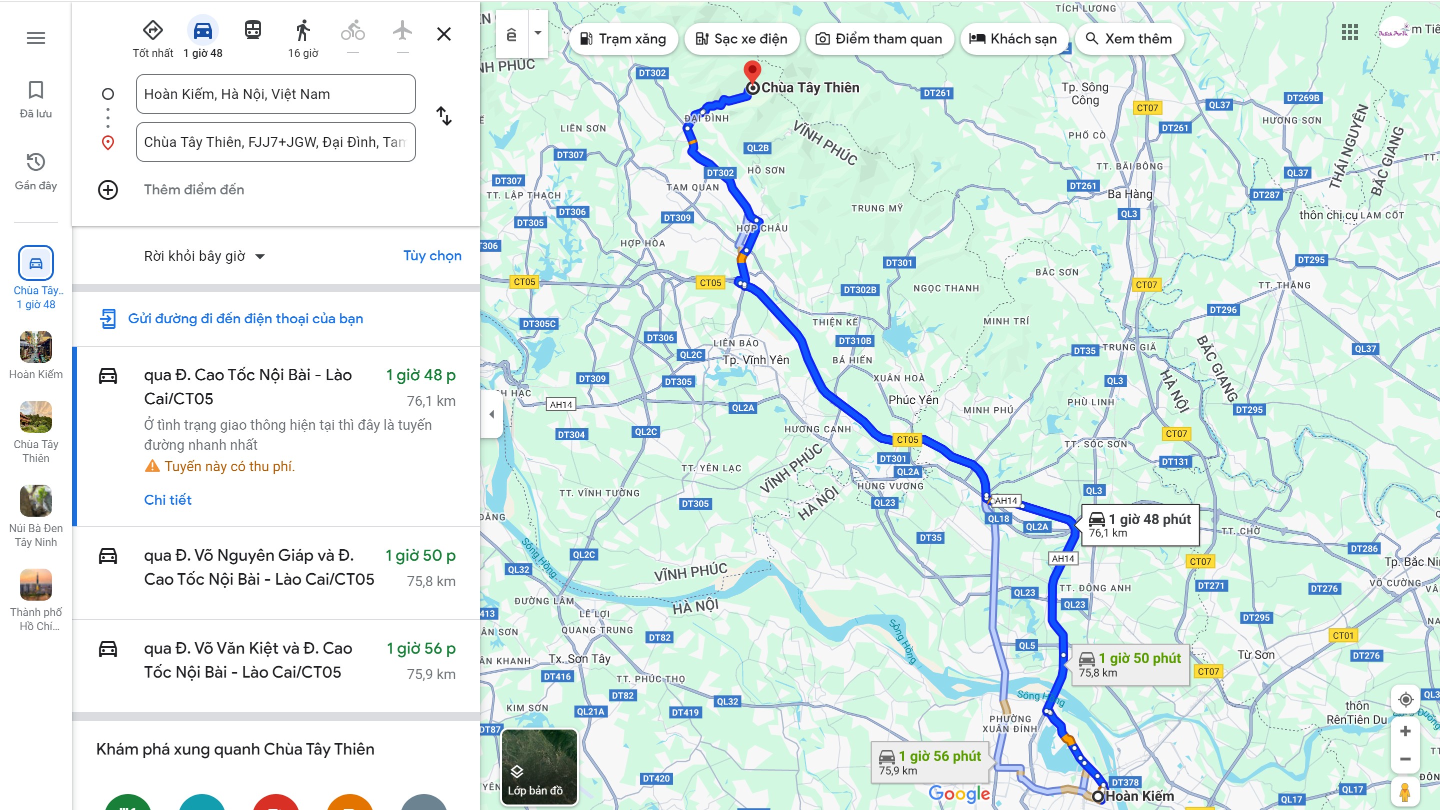 + Đi Tây Thiên bằng ô tô riêng: Để chủ động thời gian xuất phát và lộ trình di chuyển, nhiều gia đình lựa chọn đi Tây Thiên bằng ô tô. Cung đường di chuyển sẽ khác với xe máy. Từ Hà Nội bạn di chuyển hướng cầu Nhật Tân => Ngã 4 Nội Bài rẽ Phải vào QL2A đi thêm 200m rẽ Phải tiếp vào đường cao tốc Nội Bài - Lào Cai => Thoát ra tại nút giao Tam Đảo, đi thêm 14km nữa theo biển chỉ dẫn là tới được khu du lịch tây Thiên.