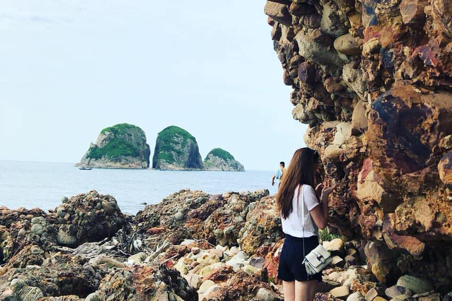 hiện ra trước mắt là hàng vạn viên đá lớn nhỏ khác nhau tròn vành vạnh vui đùa cùng làn nước biển trong xanh. Du khách ngâm mình dưới nước biển mát lạnh, tự tay mình bắt những chú ốc, truy tìm những viên đá nhiều màu sắc vô cùng đẹp mắt hiện ra mỗi khi cơn sóng ập vào. Từ Đảo Bung, du khách còn phóng tầm mắt xa xa, chiêm ngưỡng các đảo lân cận như Hòn Mê, Hòn Buồm, Hòn Ruộc, Hòn Cháy,...