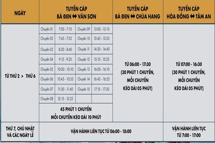 Cáp treo núi Bà Đen mỗi tuyến cáp lại có khung giờ hoạt động và vận hành khác nhau, du khách cần nắm rõ thông tin để chủ động kế hoạch cho hành trình của mình, cụ thể là: