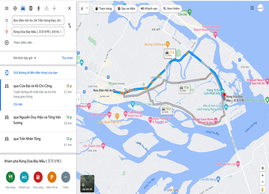 Đường đi xuất phát bằng ô tô từ TP.Hội An - Quảng Nam bạn sẽ mất khoảng thời gian gần 10p để di chuyển đến với Rừng Dừa Bảy Mẫu. Bạn chỉ cần chạy dọc theo đường Cửa Đại qua lần lượt địa phận Cẩm Châu, THPT Trần Hưng Đạo - Quảng Nam và đi thêm khoảng 600m nữa là bạn sẽ thấy Rừng Dừa Bảy Mẫu nằm phía bên phải bạn nhé !