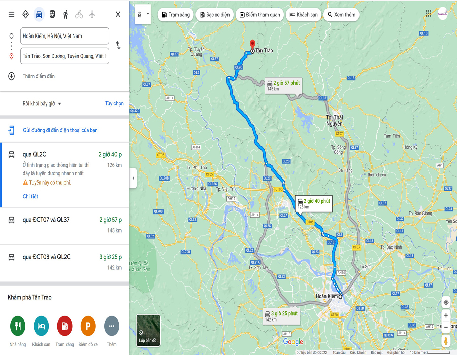 + Du lịch Tân Trào từ túc, bạn mới đi lần đầu mà chưa thuộc đường xá. Hãy tải sẵn ứng dụng chỉ đường Google Maps về điện thoại. Khi nào cần dùng, bạn mở ứng dụng nhập vào tìm kiếm từ khóa {Tân Trào, Sơn Dương, Tuyên Quang} rồi lựa chọn phương tiện của mình di chuyển. Nhấn tiếp tục tại mục bắt đầu để được điều hướng tuyến đường đi phù hợp.