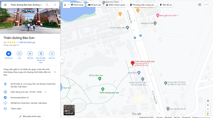 Công viên Thiên Đường Bảo Sơn địa chỉ: Km5+200, Đường Lê Trọng Tấn, xã An Khánh, huyện Hoài Đức, thành phố Hà Nội, Việt Nam.
