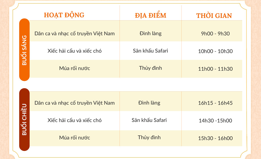 09h30: Ngoài tham quan du khách còn được tham gia nhiều hoạt động: Thăm vườn thú; biểu diễn xiếc; Vượt long môn; Bước chân kỳ bí; trải nghiệm game con đường tốc độ...
